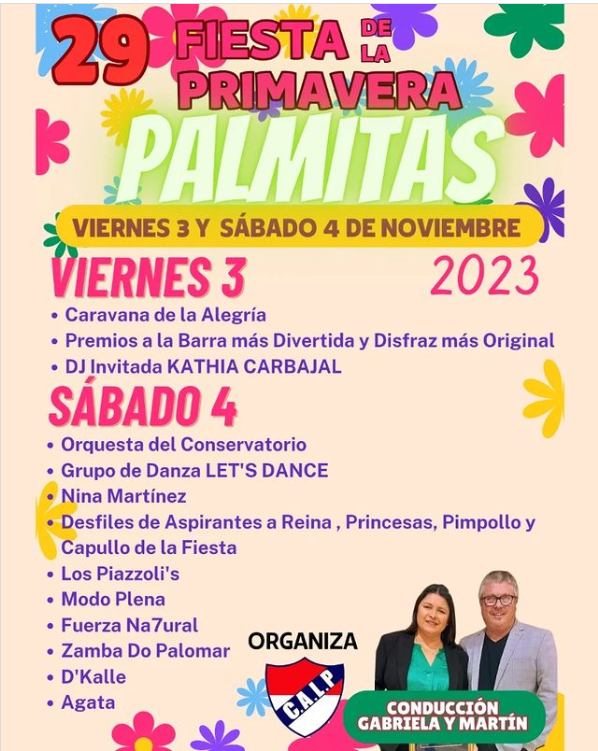 La 29° Fiesta de la Primavera en Palmitas se llevará a cabo los días viernes 3 y sábado 4 de noviembre. Este evento contará con un extenso programa de actividades y presentaciones musicales. La conducción estará a cargo de Gabriela y Martín, y la organización corre por cuenta del Club A. Libertad Palmitas.