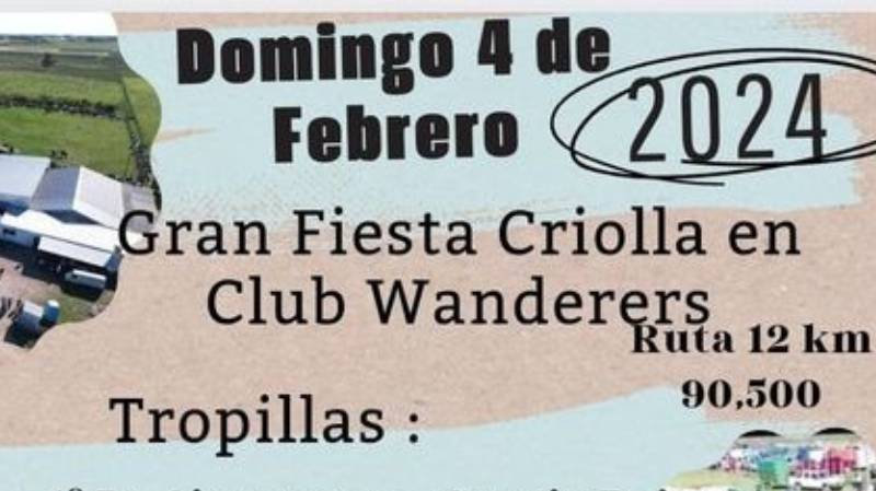 El 4 de febrero, se llevará a cabo la Celebración Criolla en el Club Wanderers, ubicado en la ruta 12 km 90.500. Contará con la participación de más de 16 tropillas. Para obtener detalles adicionales, se puede contactar con el capataz de campo, Sergio Brianza, llamando al 099 005 529.